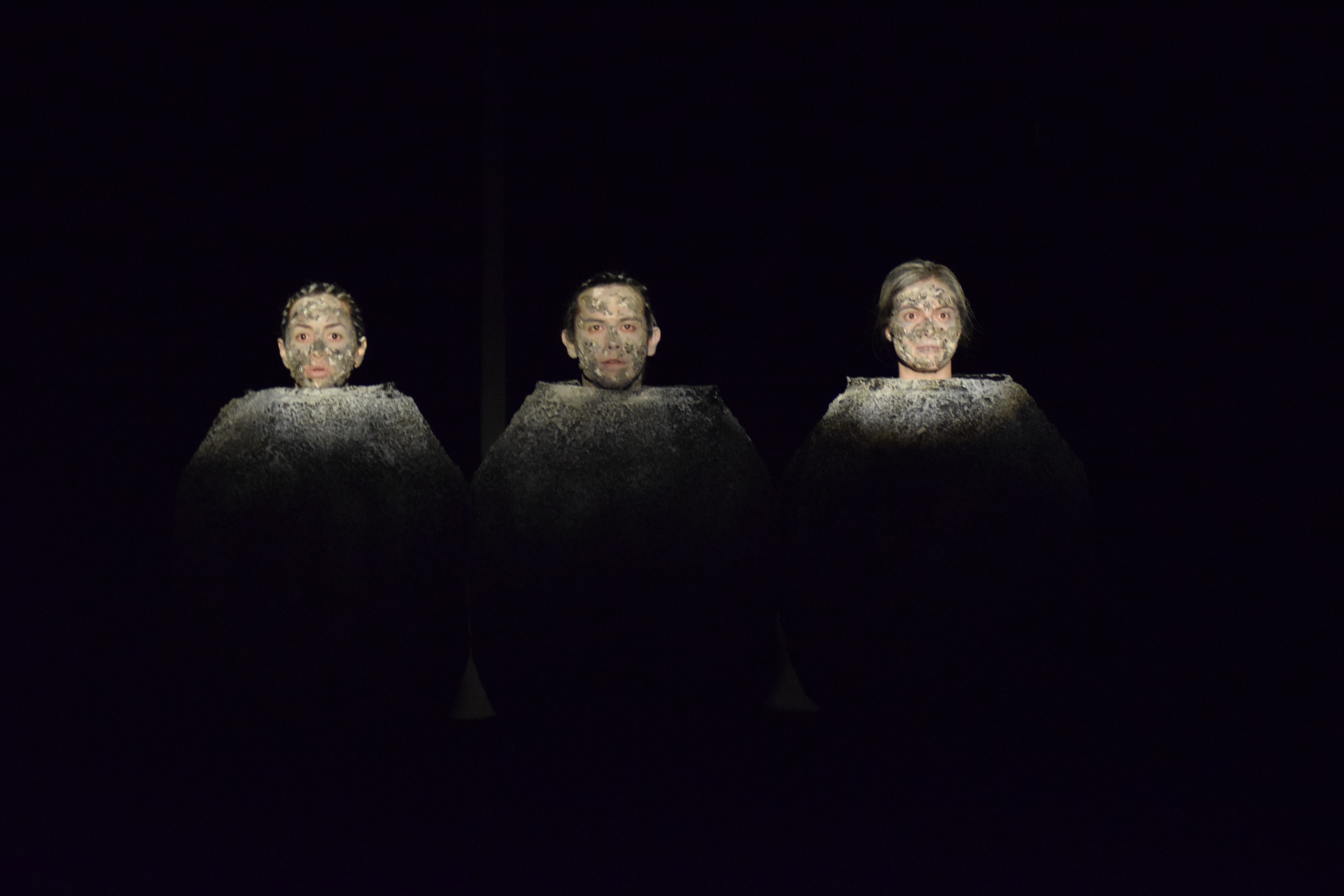 En “PLAY”, tres figuras, que a la vez son una especie de objetos o urnas; se debaten sobre el triángulo amoroso que protagonizan. La esposa, el esposo y la amante ponen al descubierto su historia de amor y traición con tintes de melodrama y comedia. Solo las cabezas de los personajes son visibles, por lo que resulta fundamental el trabajo vocal/sonoro y de actuación de los intérpretes.