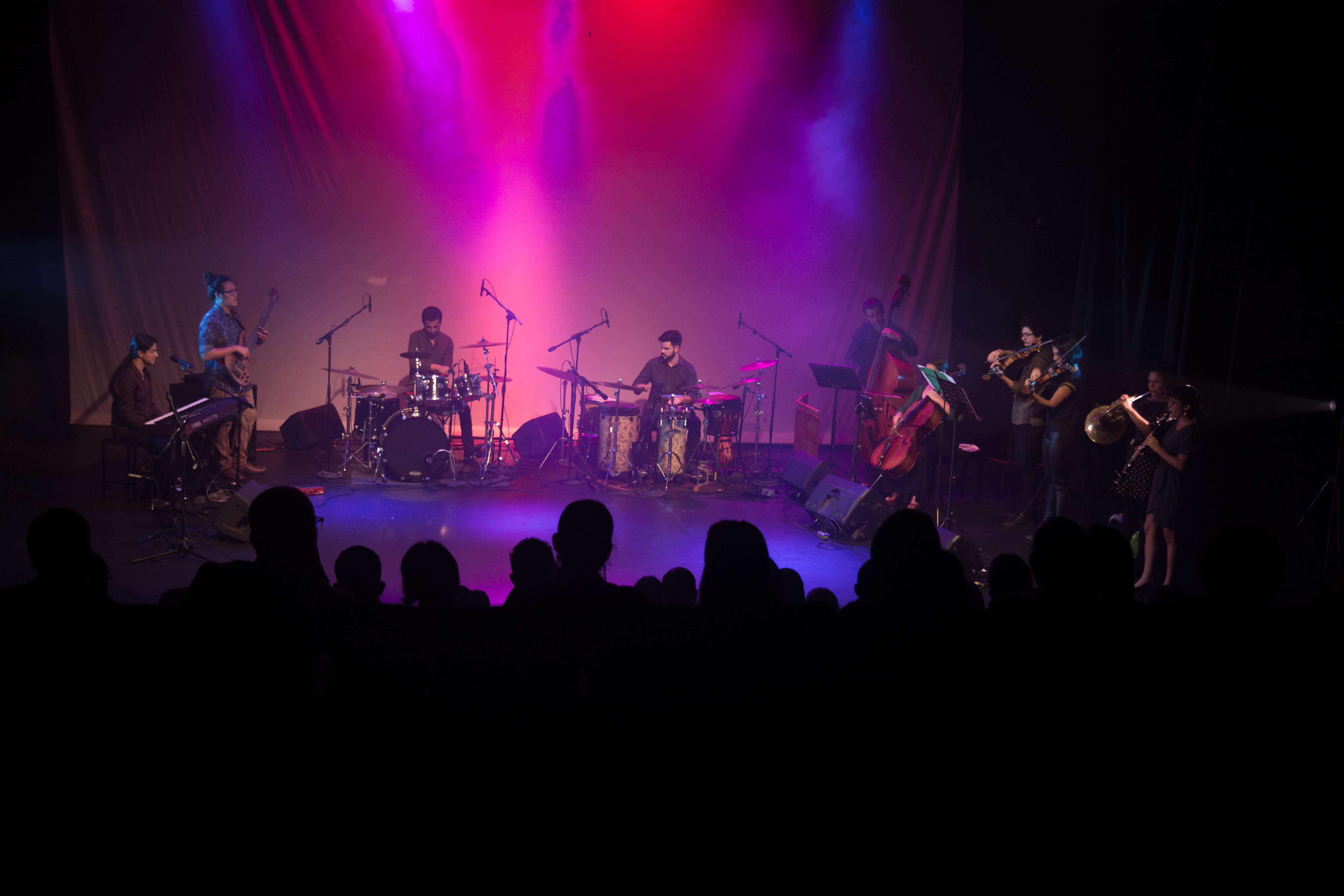 Los músicos Rubén Ramírez, batería; Brian Torres, bajo; Marianela Cordero, cello; Nelly Juárez, corno