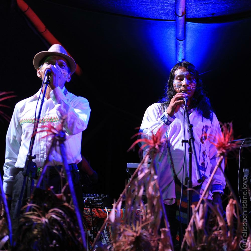Cuatro cantores indígenas en escena con una banda de músicos costarricenses y un montaje de audiovisuales en el íntimo espacio del Teatro Vargas Calvo.
