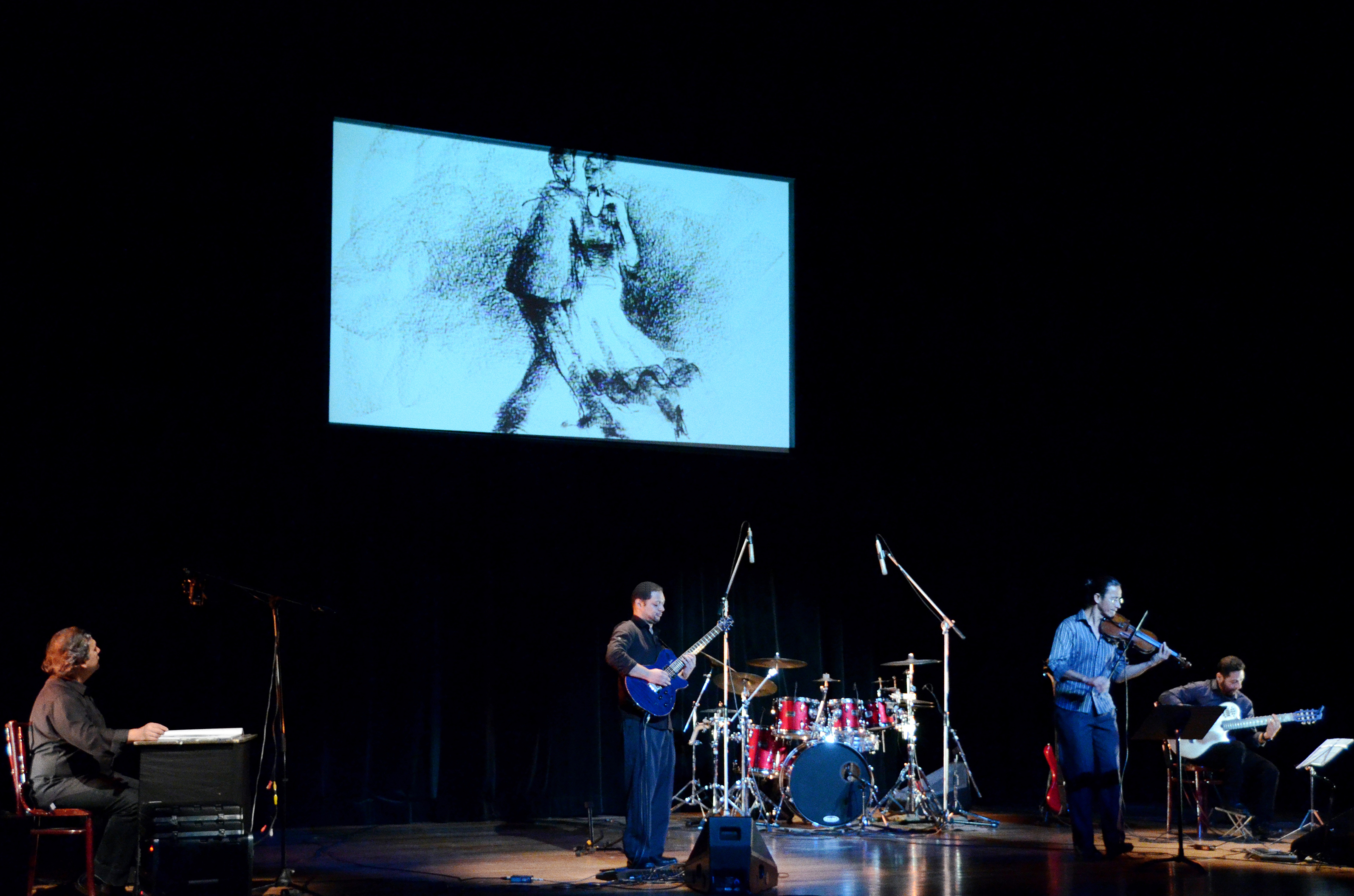 Mientras los músicos ejecutan sus instrumentos, el pintor realiza su trabajo en total concordancia con la música, resultando una propuesta muy enriquecedora.