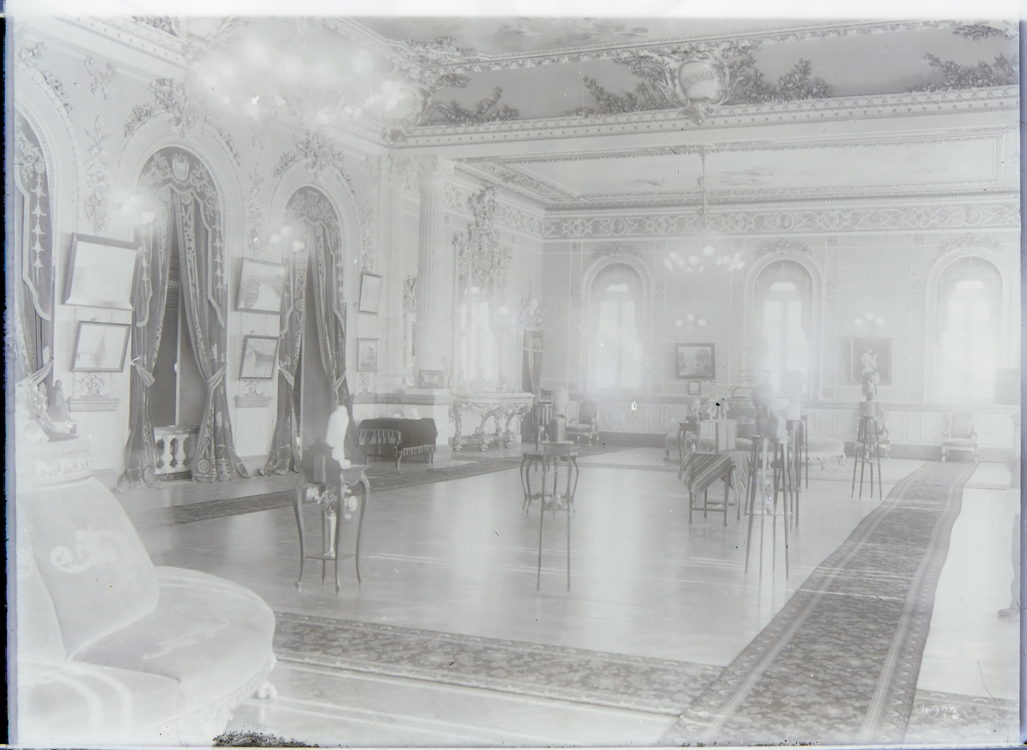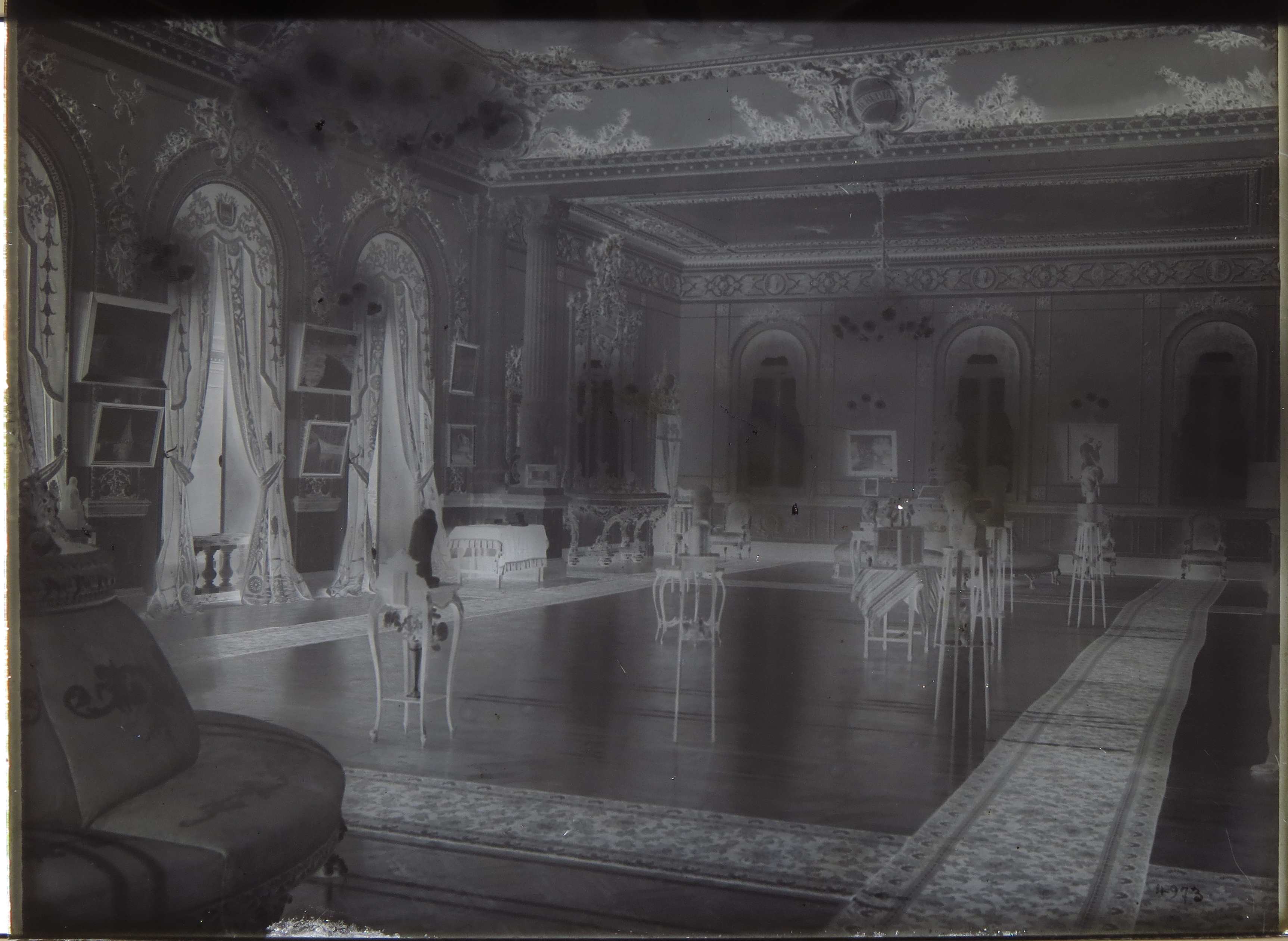 Estado a simple vista de la placa: Espejo de plata, rayaduras, leves despendimientos de la emulsión y manchas amarillas en los bordes, marcas de huellas del fotógrafo, manchas por lavado inadecuado.